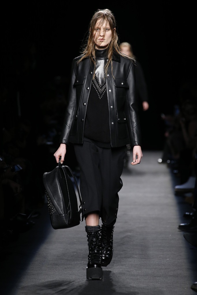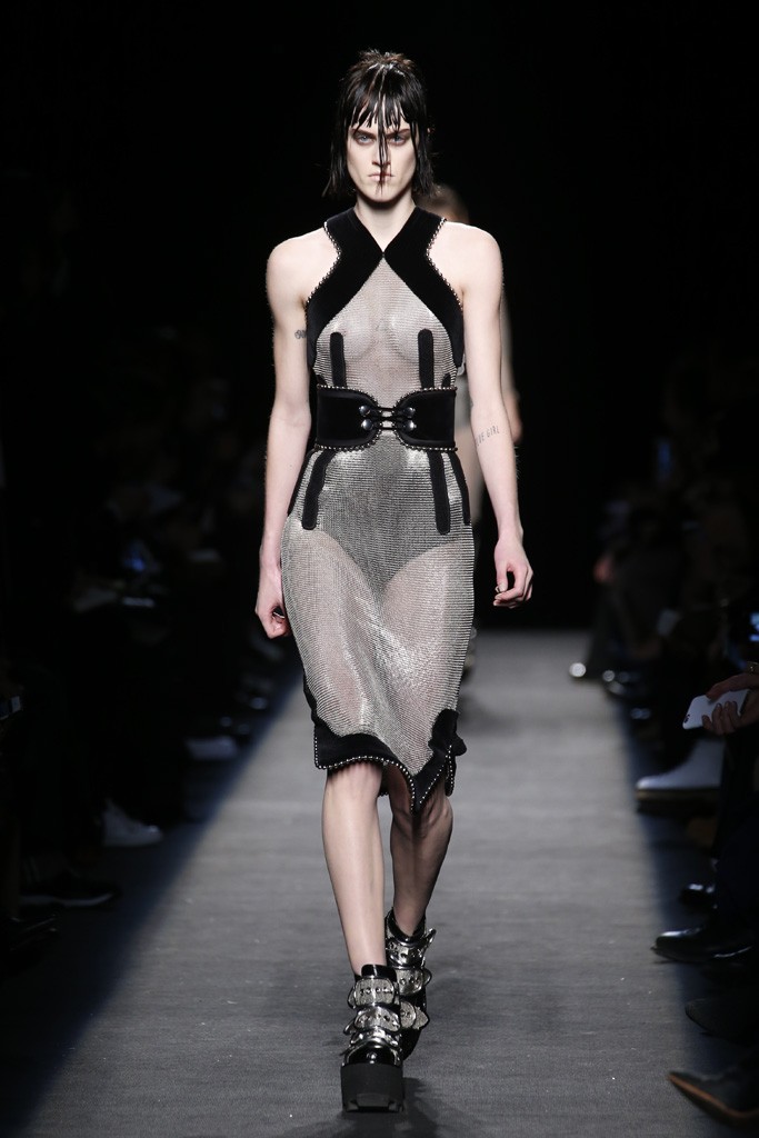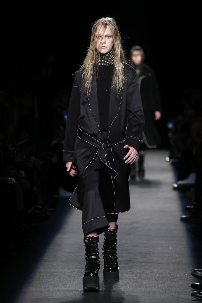 Con una paleta de colores prácticamente negra, la colección de otoño-invierno de Alexander Wang cambia del estilo sport de la última colección a una más atrevida y elegante. Looks adornados con cadenas y adornos plateados para darle un toque gótico. La mujer de Alexander Wang va a su propio ritmo con plataformas decoradas con toque en plata y largos cordones. Con cortes cuadrados y masculinos, casi militares pero dejando hueco a algun vestido negro como el lucido por la modelo Jamie Bochert o el crop top negro junto con la falda deshilachada lucido por Kendall Jenner. Los looks finales incluyeron faldas con transparencias como el lucido por la modelo de Victoria’s Secret Behati Prinsloo.