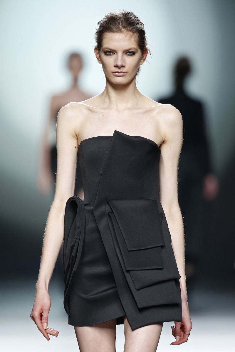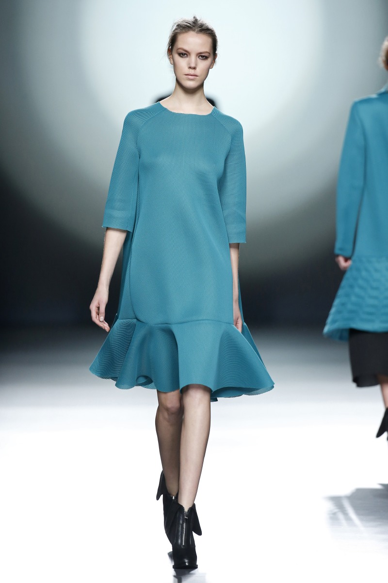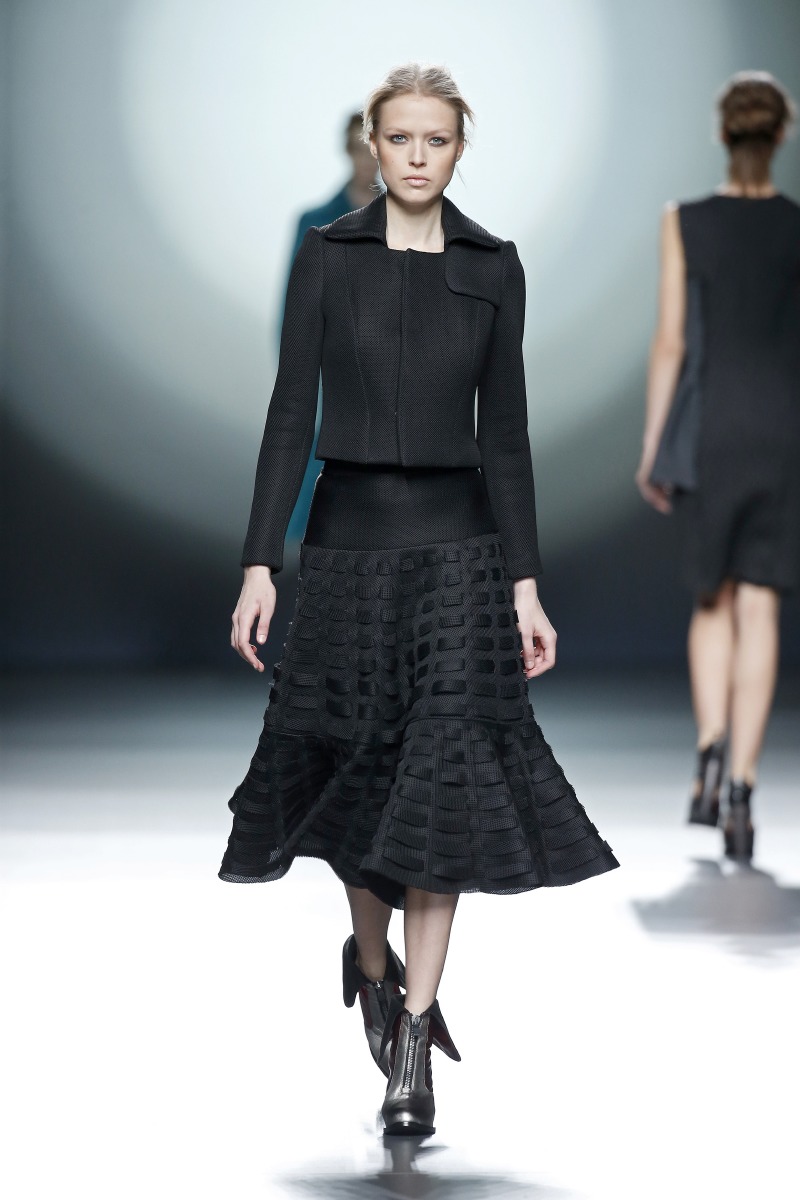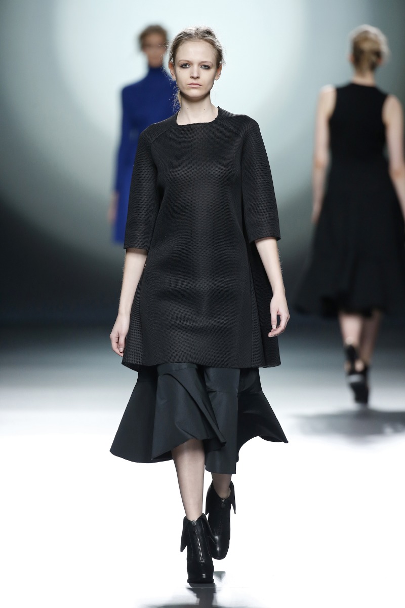 Amaya Arzuaga presentó este lunes su propuesta para la próxima temporada de otoño-primavera con una apuesta que nos trajo superposiciones de capas de tejido cortadas a láser, volúmenes acampanados junto con mezcla distintos largos en las siluetas o un trabajado artesanal de los tejidos en distintos materiales que fueron desde el tecno stén, el muflón de plumeti o neoprenos a lanas, cashemire o franela. En cuanto a la paleta de colores pudimos ver negros, granates, azules o verdes.