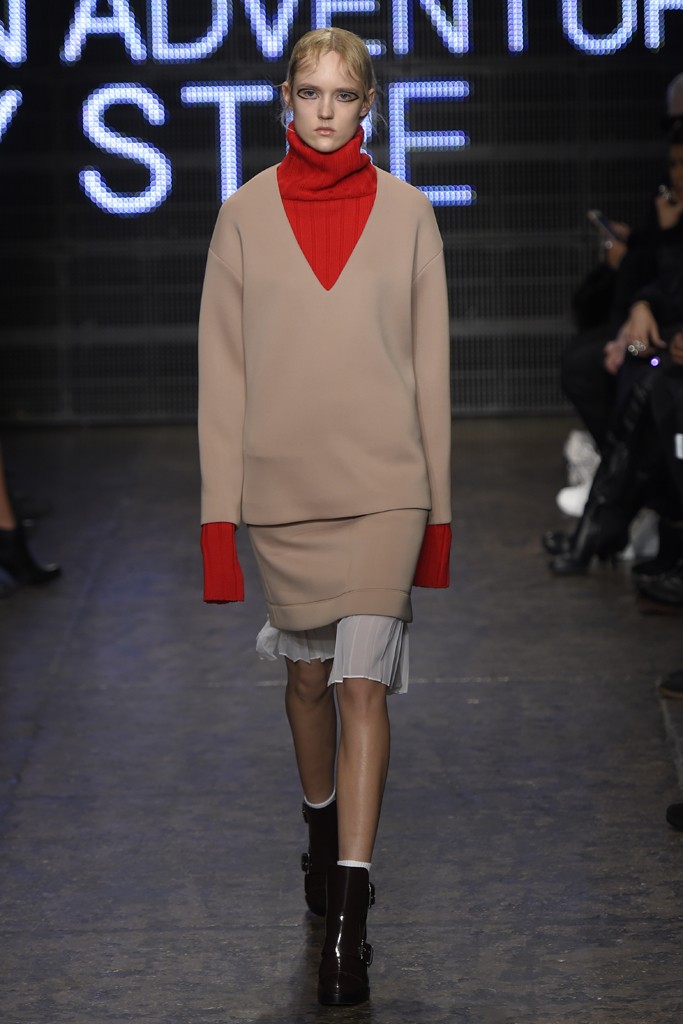 DKNY nos trajo su visión con una mujer trabajadora con esta colección de inspiración masculina con trajes entallados en color negro, gris y marino, jerseys con textura de cuello alto o abrigos oversized con patrones en espiga. Karan busco la inspiración en el skyline de Manhattan para diseñar faldas y vestidos con transparencias asimétricas y por supuesto la aparición de pelajes de imitación que están siendo tendencia para esta temporada. También destacar la pantalla led que encabezó el desfile donde iban apareciendo tuits en sobre lo que New York significaba para los usuarios de Twitter.