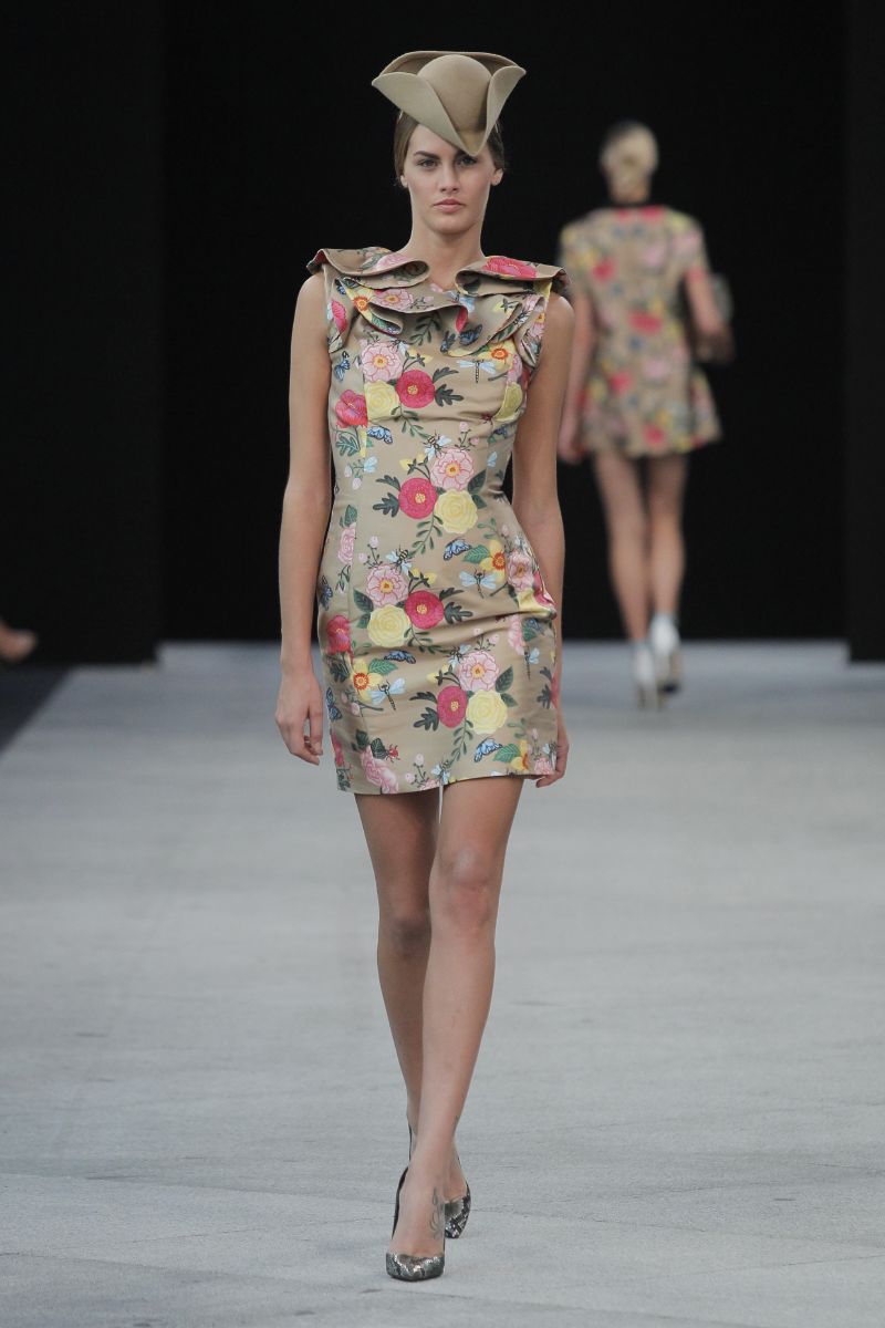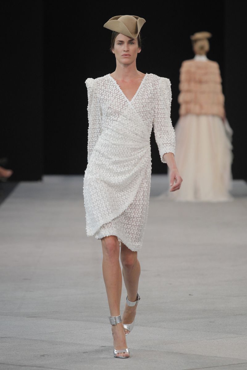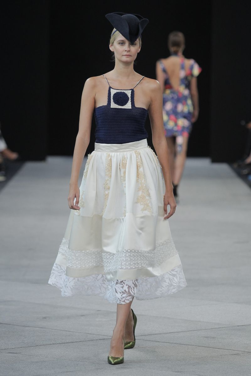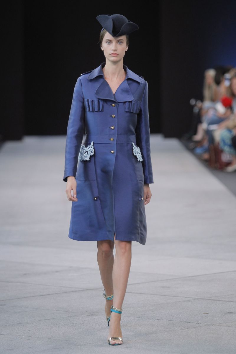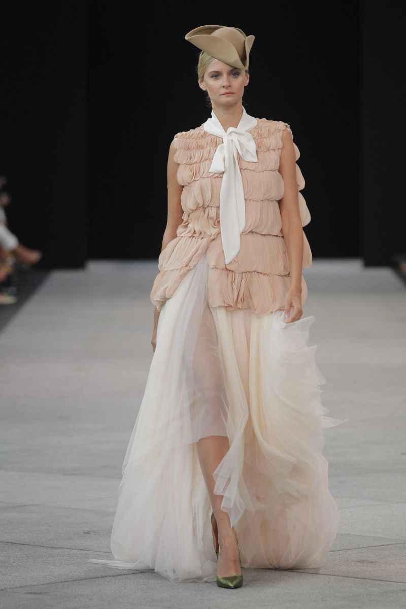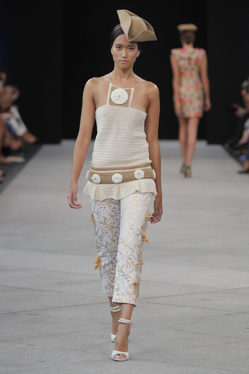 Sobre la pasarela encajes de flores de algodón, tafetanes, algodones, gasas y sedas combinaban con punto de ganchillo artesanal. Los colores predominantes han sido los marinos, el camel, el crudo y el beige, consiguiendo contrastes con el negro. Las flores, esencia de la firma, tampoco han podido faltar, que proliferan como bordados artesanales, con efectos tintados.