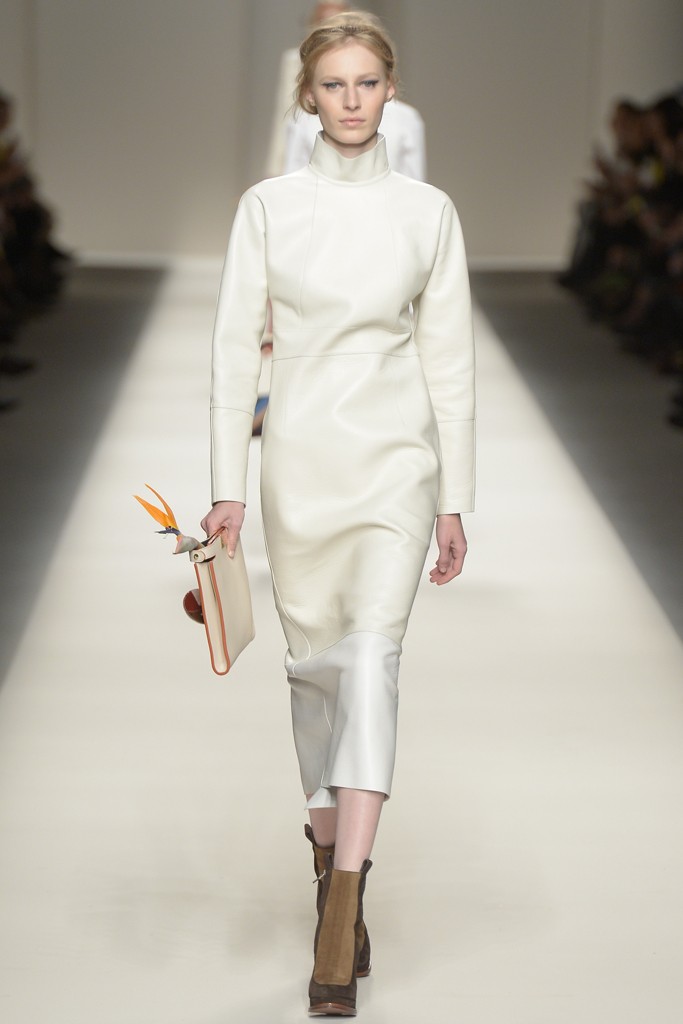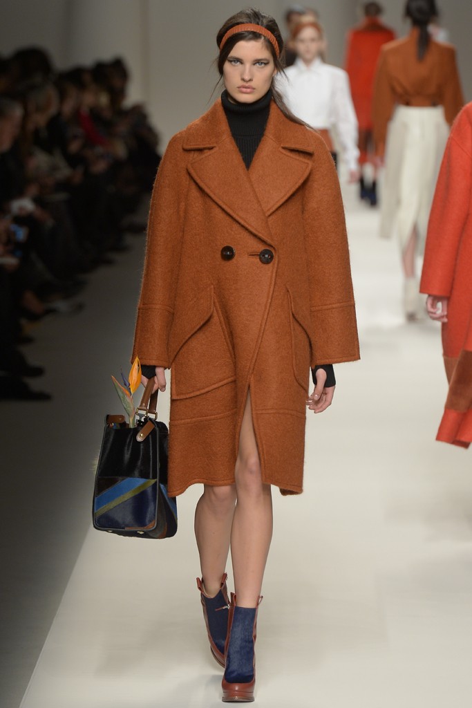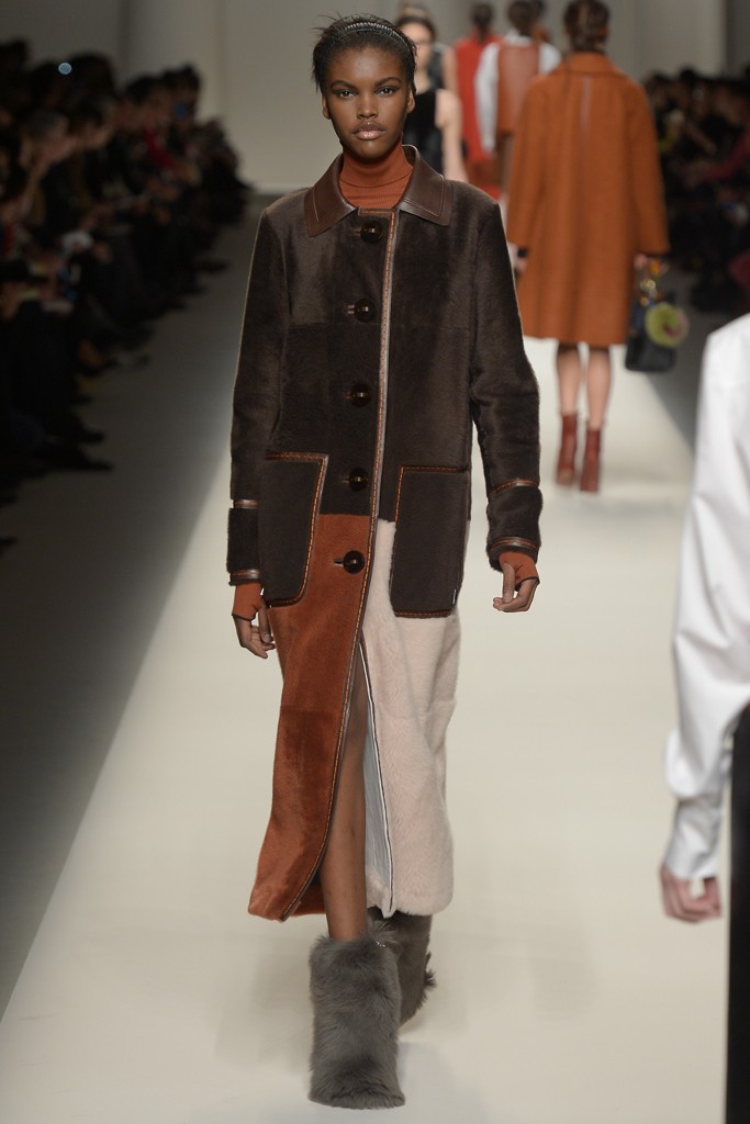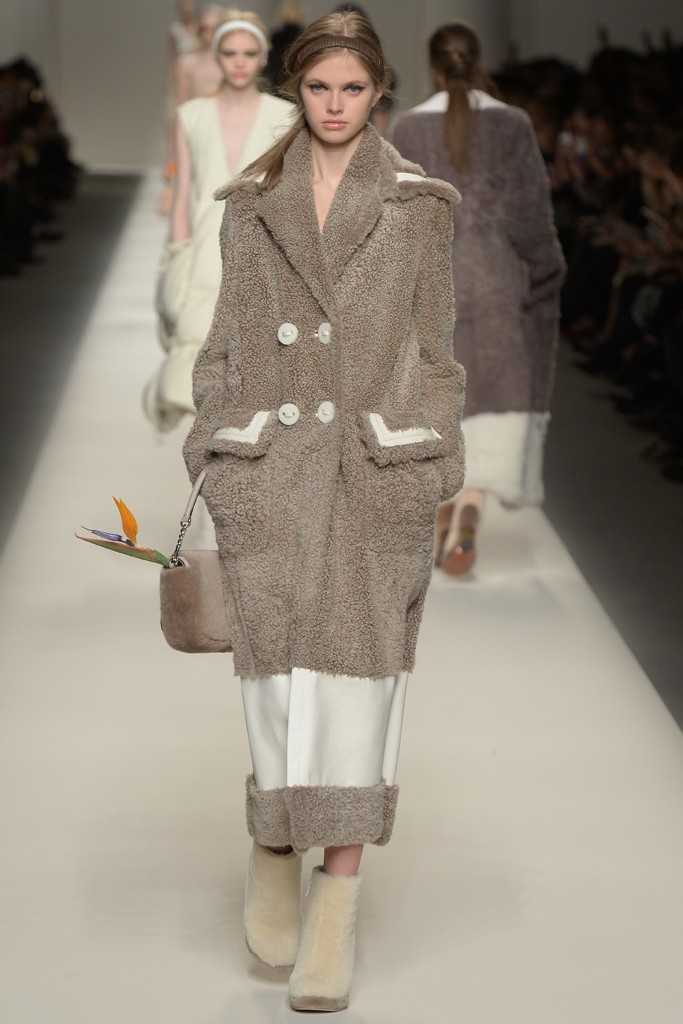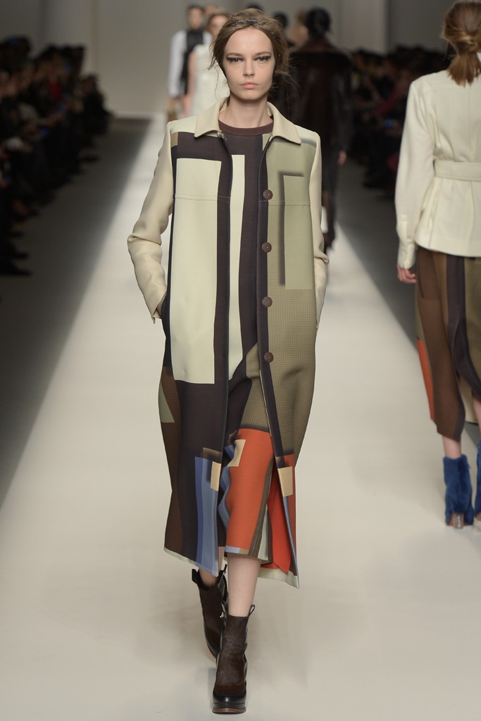 Fijándose en la artista suiza Sophie Taeuber para buscar inspiración, la colección de otoño invierno de Fendi fueron lineas limpiar con un juego de volumen. Karl Lagerfeld y Sylvia Venturini mandaron a pasarela brillantes looks incluyendo culottes, amplios abrigos y vestidos a capas sobre peludos pantalones. La paleta de colores varió entre naranja quemado y blanco o rojo intenso a simple negro. El bolso peekaboo también tuvo su renovación con adornos.