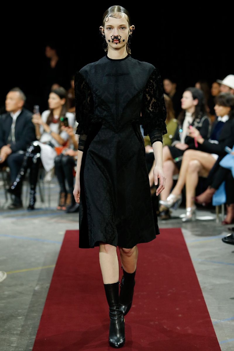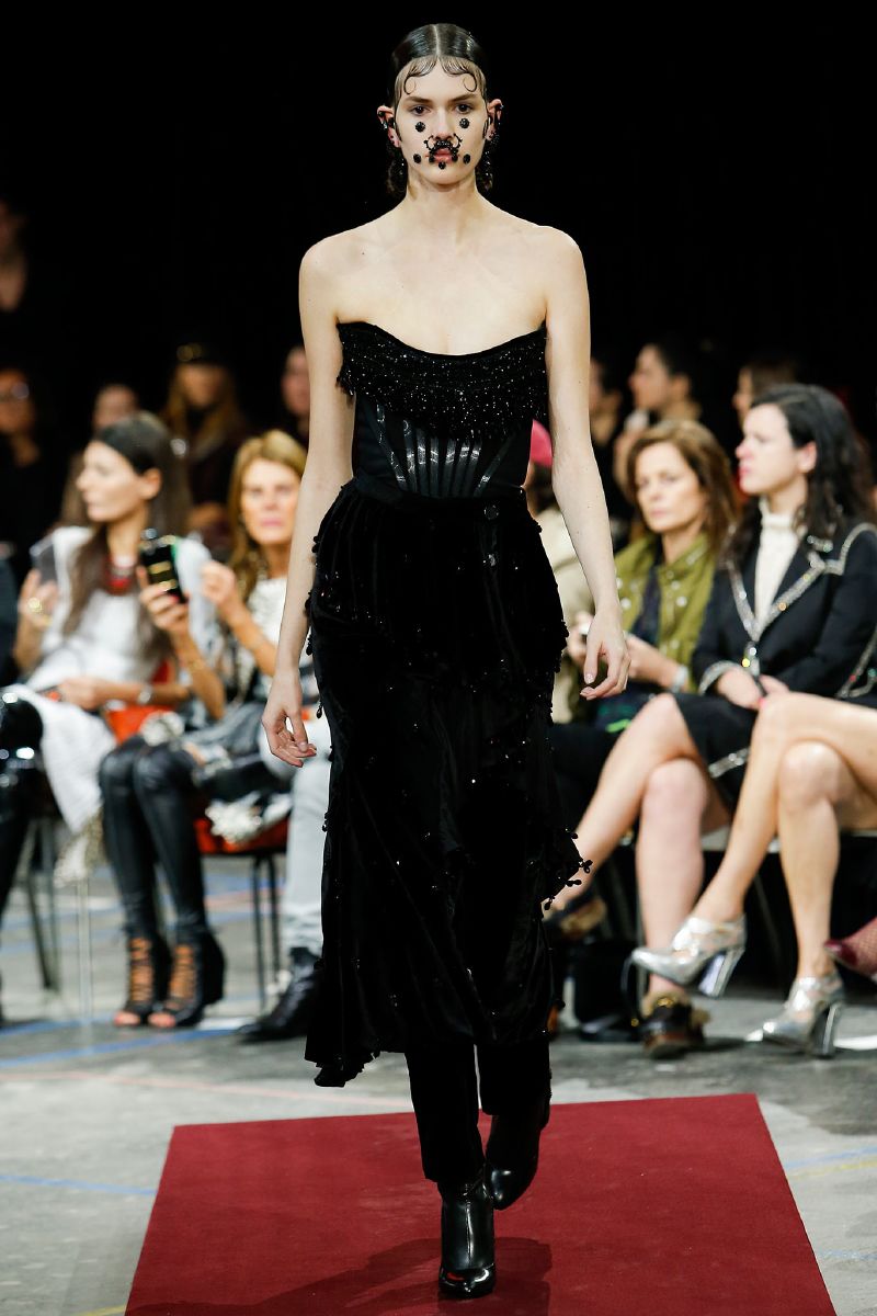 Givenchy nos presentó hoy su nueva propuesta para la próxima colección con modelos cargadas de joyas en la cara que incluían joyas pegadas a la cara o enormes aros en la nariz pero a pesar del carácter marcado y urbano que podía darle ese toque la colección estuvo cargada de oscuro romance. Grnades abrigos y vestidos de seda con estampados victorianos, dramáticos abrigos de corte péplum, holgados vestidos con transparencias o corsés que dejaban ver el cuerpo. Apostamos que Katy Perry no tardará mucho en aparecer con algunas de estas joyas.