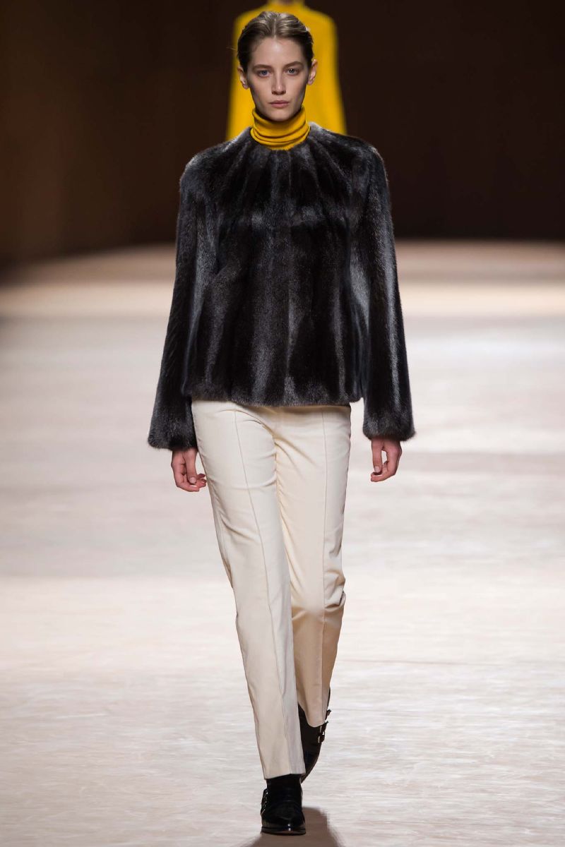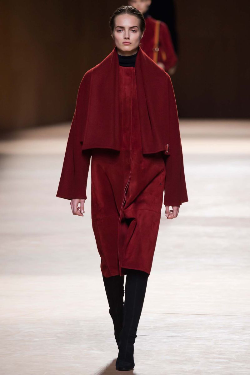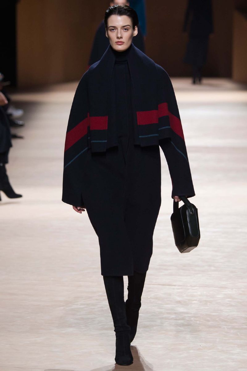 Para la próxima colección de Hermés la pasarela se lleno de elementos sagrados para la casa, abrigos de cuero artesanal, pantalones straight con diferentes tiras de cuero y ante. La icónica bufanda volvió como blusas de seda. Por encima de todo se pudo observar que los looks eran minimal, con una tradición guiada a través del espectro del lujo.