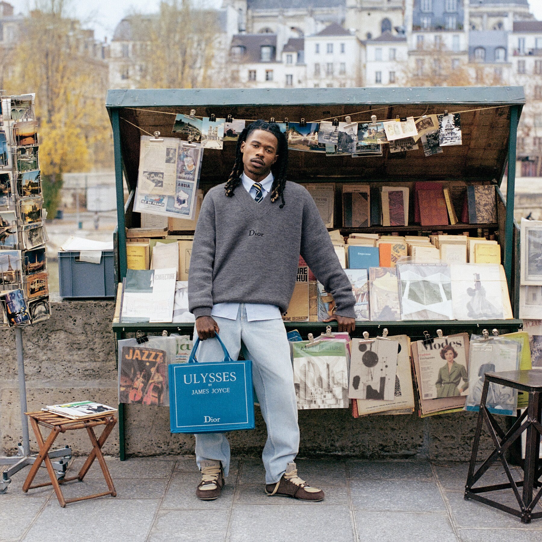 La máxima expresión de la creación de estos bolsos (que espero que siga añadiendo títulos en un futuro próximo) se ve reflejado en la campaña que acompaña al lanzamiento. Una producción que explora las riberas del río Sena, dónde cientos de puestos con antigüedades (en especial, libros y contenido impreso del siglo anterior) con un casting curado por Anderson, con nombres de diferentes expresiones culturales. Podemos observar la ambigüedad de 070 Shake con el llamativo amarillo de la portada original de “Drácula”; al hijo de François Sagan junto al título escrito por su padre, “Bonjour tristesse”; una inspiradora Nine d’Urso con “Les Liaisons Dangereuses” de Choderlos de Laclos; “Les Fleurs du Mal” de Baudelaire en manos de Raphael Quenard; o al Book Creator negro, Travawyn Taylor, reivindicando su oficio y la importancia de reinterpretar clásicos, como lo hizo en su día “Ulysses” de James Joyce (o la película, por ahora criticada, “The Odyssey” de Christopher Nolan).